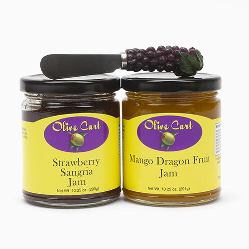Our most popular two jams are our Mango Dragon Fruit and Strawberry Sangria jams and with good reason. They are just plain incredibly delicious! This set will come shrink-wrapped along with a handsome grape cluster spreader. The set costs less than the individual items.