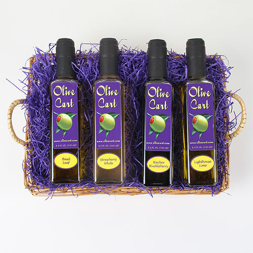 Your choice of two of our 250ml incredible EVO oils and two of our 250ml rich dark or white balsamics all handsomely wrapped in a reusable wicker basket. Gift basket design may vary somewhat, specialty oils not included. Please call either of our stores - South Haven (269) 637-4754 or Saint Joseph (269) 281-0120 to order this item, and we will personalize your gift basket for you.