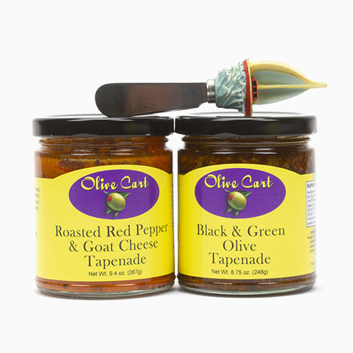 Our Black & Green Tapenade and our Roasted Red Pepper & Goat Cheese Tapenade are our customer’s favorites. They are the feature of this 2-pack gift set along with a handsome sailboat spreader all shrink-wrapped together and ready for gifting. A great deal too as our gift set price is less than if you bought these items individually.