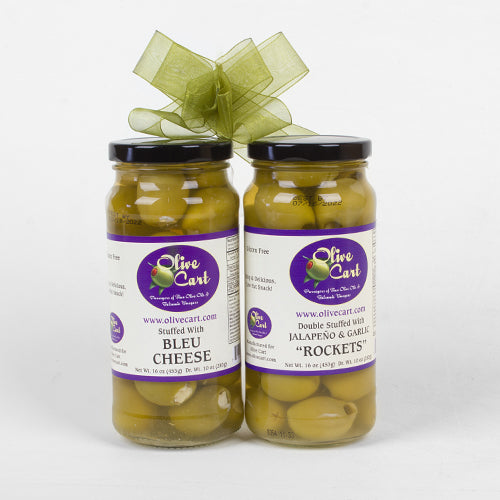 A great gift for the olives lover, the martini lover or just to keep for yourself. Your choice of any two large jars of our fantastic stuffed olives. We shrink wrap it with a bow so it is ready for gift giving. A great savings on the two-pack as well!